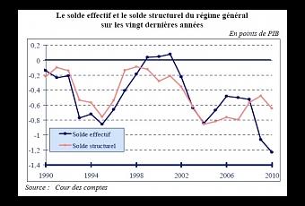 La crise économique ne justifie que partiellement ce déficit et son aggravation, (Voir courbe ci-contre) précise la Cour des Comptes : En 2010, le déficit structurel du régime général a été d'environ 0,7 point de PIB sur un déficit total d'1,2 point. Un déficit qui entraîne un accroissement de la dette sociale (136 Mdeurofin 2010) qui avec le principe des transferts de déficits s'élève désormais à 260 Md€.