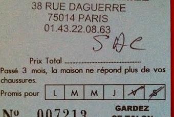 Ce sont ces petites choses qui me font aimer le quotidien, ma vie, quoi. Un cordonnier aimable dans une boutique-capharnaum. Qui, me gratifiant d'un sourire, me dit bonjour. Et m'explique que oui oui c'est possible, qu'il peut faire ceci. Ou bien cela. Qu'il m'en coûtera tant. Et ce sera prêt dans. Me tend le bout de carton qui fait foi. Salutations.Dans la rue, la lecture de ce petit carton (illustration) m'émerveille.