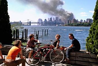 Sur cette image du photographe Thomas Hoepker, prise le 11 septembre 2001, on voit cinq jeunes New-Yorkais décontractés, en discussion au bord de l’eau, quelque part à Brooklyn. Derrière cette scène paisible d’un jour ensoleillé, le terrible nuage de fumée et de poussières de Manhattan avec ses légendaires tours jumelles frappées par les avions détournés par les terroristes.