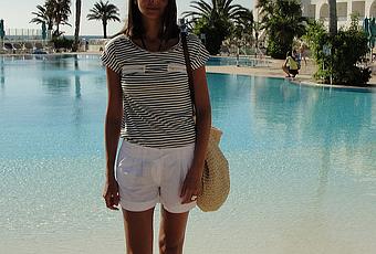Un short blanc, une marinière agrémentée de petits détails dorés.