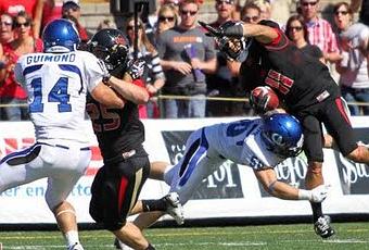 L’athlète de 22 ans originaire de Trois-Rivières a réussi pas moins de dix plaqués en solo contre la formation numéro un au pays dans une défaite de 24-14. Avec ses huit plaqués assistés, son total s’est porté à 14, un nouveau record d’équipe. L’ancienne marque, partagée par Étienne Vanslette et Joash Gesse, était de 11.
