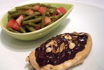 Servez les filets de poulet nappés de sauce au chocolat bien chaude et saupoudrez d'amandes effilées grillées.