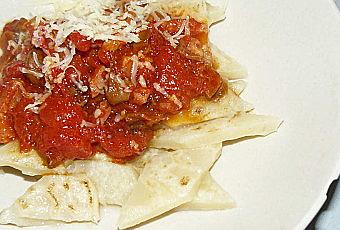- Au bout de ce temps égouttez les testaroli , disposez-les dans une assiette creuse, ajoutez la sauce et saupoudrez de râpé ou mieux de pecorino.