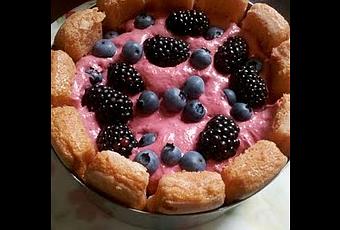 Montage de la charlotte :Dresser des biscuits roses de Reims légèrement imbibés de sirop sur le fond et le bord intérieur du cercle (chemiser d'une rodoïd préalablement si possible) afin de le "tapisser" complètement. Ajouter un peu de crème chiboust puis ajouter des fruits rouges frais puis renouveler l'opération en prenant soin de ne pas laisser d'air, d'espace jusqu'à hauteur des biscuits. Réserver au frais au moins une nuit avant dégustation. Au dernier moment décorer de divers fruits rouges.