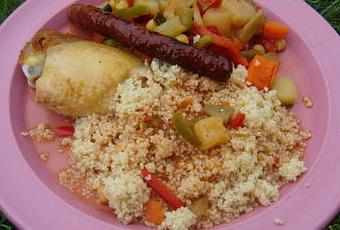 1.5 kg de légumes à couscous surgelés, 6 côtes d'agneau, 4 cuisses de poulet coupées en 2 , 6 merguez.
