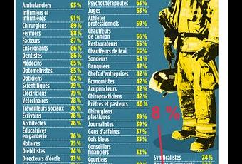 L’édition 2011 du Baromètre des professions de Léger Marketing confirme l’impopularité des politiciens.Dans le premier décile du Baromètre nous retrouvons les pompiers (97 %), les ambulanciers (93 %) et les infirmières et infirmiers (91 %).