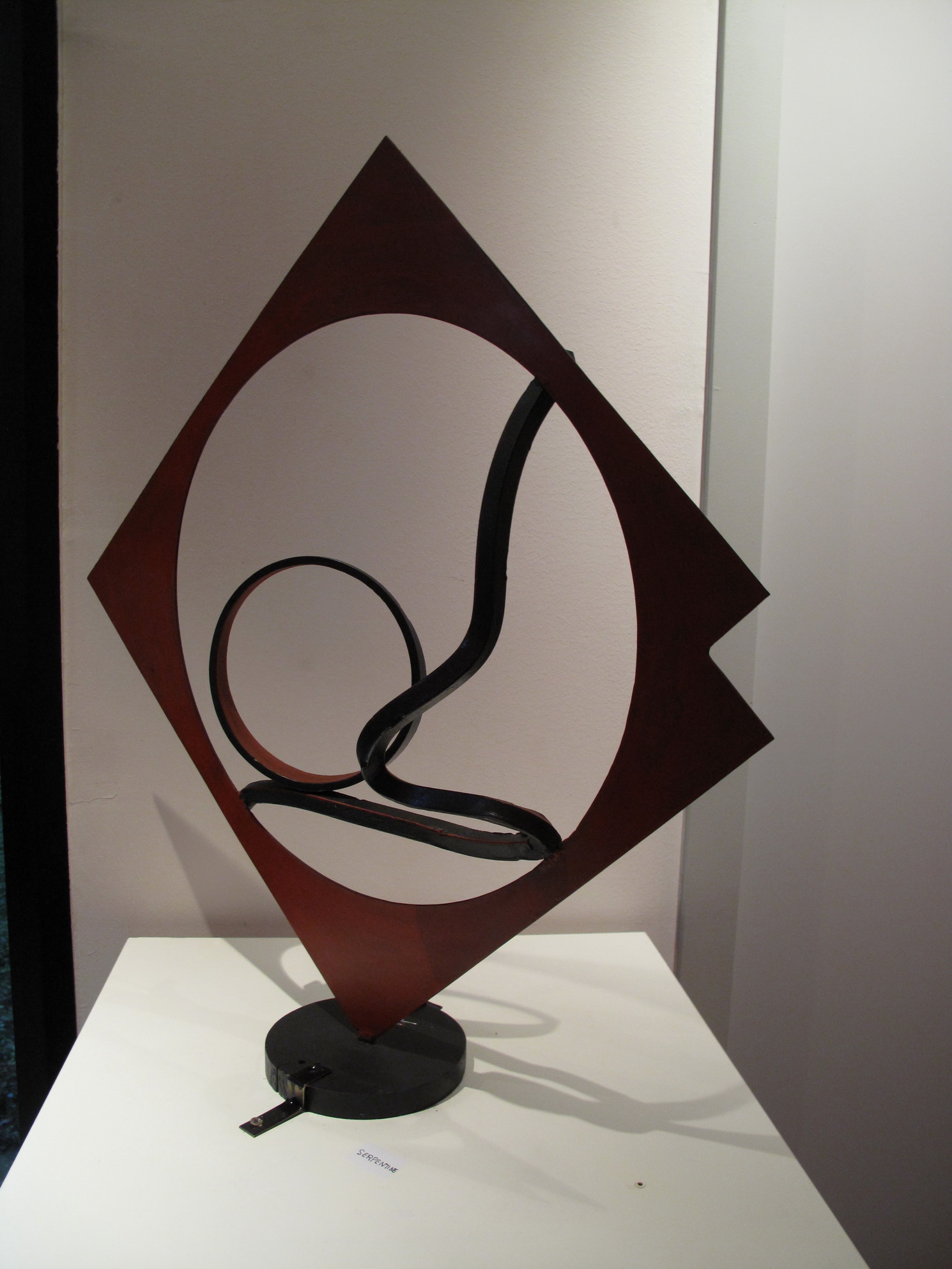 Côté sculptures,ce qui m’a toujours séduite chez Fuggio,ce sont les relations étroites entre celles-là et ses peintures. Quand elle dégote chez les ferrailleurs de superbes formes vieilles et rouillées,qu’elle fait revivre en une seconde existence (sans pour autant ni les déformer ni les modifier),on a l’impression de voir le graphisme de ses toiles passer en 3 D! Rapports évidents!Etonnant!