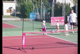 Avec son short rose et son bobElle retire déjà la terre battue de ses baskets avec sa raquette: