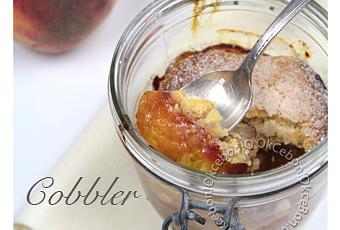 Sortir le plat du four et verser la moitié d'un verre d'eau. Gratter et décoller délicatement le caramel de cuisson et répartir le tout dans des bocaux ( ou des petits plats individuels) avec par dessus une grosse cuillère de pâte à cobbler sur les pêches chaudes.