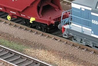 L'ensemble de la voie a été traitée avec des nuances de couleurs, la proximité des mécanismes d'aiguilles a été teinté en brun sombre (presque noir) pour figurer la graisse. L'intérieur des profilés de rails a été foncé pour créer un contraste avec le profilé extérieur comme en réalité. Les voies de l'annexe traction ont été assombries pour simuler les dépôts de graisse et de gasoil. N'oublions pas qu'il s'agit d'une annexe traction thermique et que les gros diesels sont salissants.