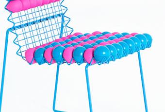 Designé par Bashko Trybek, le fauteuil Anti Stress est un concept d’assise comprenant une structure métallique dans laquelle sont coincées des boules anti-stress.