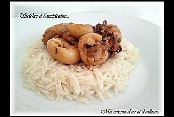 Faîtes sauter les seiches dans un peu d'huile d'olive. Réservez. Faites suer les oignons et l'ail écrasé. Saupoudrez de farine, mélangez et déglacez avec le vin blanc, l'armagnac et un peu d'eau.