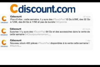 Ca faisait longtemps que je vous avait pas parle de la tablette tactile de l’annee, la Touchpad et oui qu’on le veuille ou non ce’st bien la tablette qui a marquee cette annee 2011. Aujourd’hui se procurer cette tablette est devenu mission impossible et apres les echecs de vendeurs comme The Phone House ou de cyber marchands qui se sont fait plus d’ennemis que de clients, c’est Cdiscount qui annonce sur Twitter une vente de Touchpads. Pas beaucoup de renseignements sur la date ni l’heure, il est probable que Cdiscount ne veuille pas d’une vente programmee comme celle de RueDuCommerce qui avait plus de deçus que d’heureux.