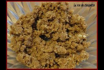 Papoune n'aimant pas trop le mélange poire-chocolat fondu, j'ai fait deux crumbles différents : 1 au chocolat et un au caraméloos.