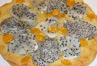 Recouvrir de lamelles de fruit du dragon et de physalis.
