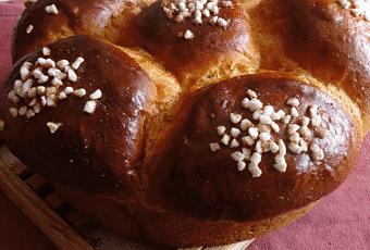 5) Préchauffez votre four à 180°. Dorez à l'oeuf et saupoudrez de sucre en grains, enfournez pour 35 à 40 minutes.