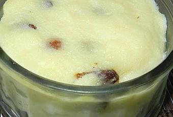 100 g de raisins secs4 cuillères à soupe de rhum brun3/4 de litre de lait2 pincées de sel100 g de sucre en poudre100 g de semoule de blé fine50 g de beurre2 œufs