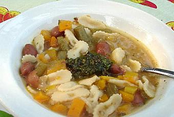 Couper tous les légumes en petits cubes, ainsi que le lard. Faire revenir les ensemble les oignons et le lard. Ajouter les légumes (sauf les haricots en grain, vers la fin s'ils sont déjà cuits), le bouillon de poulet et couvrir d'eau. Saler et poivrer. Cuire jusqu'à ce que les légumes soient tendres, puis ajouter les pâtes.