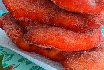 Transvaser la pâte sur un plan de travail légèrement fariné et la replier une ou deux fois sur elle-même. Diviser en morceaux de 50-55g environ (soit la taille d'une balle de golf) que vous façonnerez en boules. Au fur et à mesure que vous avancez, poser les boules sur une surface farinée recouverte d'un linge propre. Préparer le mélange sucre-cannelle en mélangeant intimement ces deux ingrédients. Verser uniformément sur une assiette. Réserver. Chauffer l'huile à 185°C (375°F). En commençant par la première boule façonnée, étaler les boules en tapotant du bout des doigts de manière à former un ovale d'environ 5 cm x 10 cm.Déposer sur le plan de travail fariné, couvrir avec un torchon propre et procéder de même avec les autres boules de pâte.