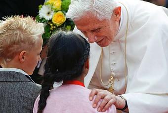 Jeudi, dès son arrivée en Allemagne, le pape Benoît XVI a été accueilli par des sympathisants, comme ici ou des jeunes enfants l’attendaient à l’aéroport international de Tegel. Ce voyage de