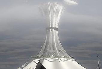 Vous vous souvenez peut-être de la ville offshore Turbine City ou du gratte-ciel sous-marin de Sarly Adre Bin Sarku. Voici aujourd’hui un autre projet de gratte-ciel maritime conçu par l’architecte Alexander Krasinski. Il s’agit d’un gratte-ciel flottant prenant la forme d’une île artificielle dont la vocation est d’offrir un espace d’habitation à d’hypothétiques survivants climatiques. Un projet très militant qui peut évoquer les projets de Vincent Callebaut. Ce qui caractérise ce projet est également son envergure, puisque le gratte-ciel est conçu pour 52 096 personnes, pour culminer à une hauteur de 1000 mètres avec un diamètre à la base de 1000 mètres. Le gratte-ciel comporterait ainsi plusieurs aéroports et plusieurs ports. Une véritable ville flottante.