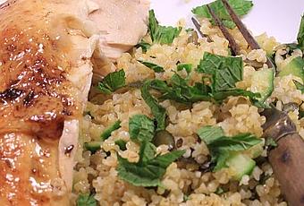 Pour 4 personnes : 1 poulet fermier 2 citron bio thym /romarin huile d'olive 300 gr de boulgour 20 gr de graines salées de citrouille 1/2 concombre de la menthe
