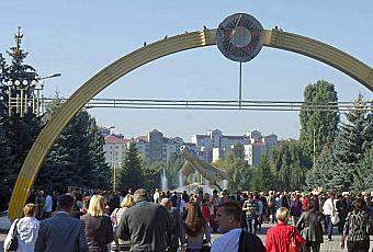 avec cet arc de triomphe soviétique ( CCCP ) s'ouvrant en frontispice sur une allée où trône à l'horizon un Mig des années cinquante encore présent comme vestige d'un passé qui laisse encore une empreinte...
