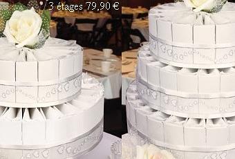 Un vrai gateau de mariage composé de boites a dragées? Boites a dragées blanches qui composent ce magnifique gateau de mariage blanc et argent! Disponible en deux étages ou trois étages: ce gateau peut servir de centre de table, de décoration de table ou bien de boites a dragées pour aniversaire de mariage!