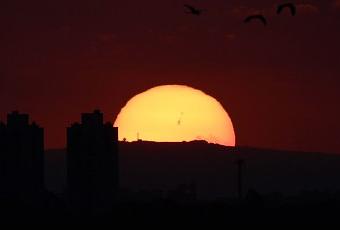 La tache solaire AR1302, plusieurs fois évoquée ces derniers jours est si grande qu’elle est visible à l’oeil nu à la surface du Soleil. Attention de ne pas regarder le Soleil directement sauf avec un filtre adapté ou d’attendre le coucher du Soleil !