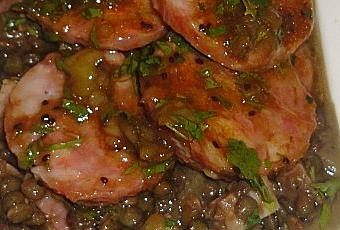 240 g de lentilles-1 cube de bouillon de légumes-2 tranches de poitrine nature- vinaigre balsamique-huile d'olive-1 saucisse de morteau1/2 fruit de la passion-persil plat-le jus de cuisson des lentilles