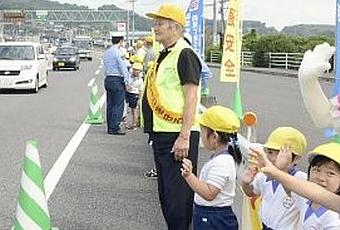 Il n y a qu'au Japon qu'on peut voir ça ! Dans le cadre de la campagne nationale de sécurité routière de cet Automne qui incite les japonais à conduire prudemment , Hello Kitty et un groupe de 27 élèves de maternelle , ont étés au bord d'une route nationale et comme vous pouvez le voir , tout ce beau petit monde saluait les conducteurs ( et distribuaient un dépliant apparemment aussi ...) ! Une chose est sûr , impossible de ne pas les voir ^^