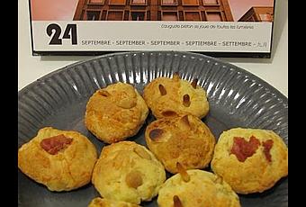 60 gr de farine 1/2 CC de levure 1 pincée de sel 20 gr de beurre 10 gr d'emmental 30 gr de camembert Déco: amandes, pignons, jambon sec, cacahuètes...