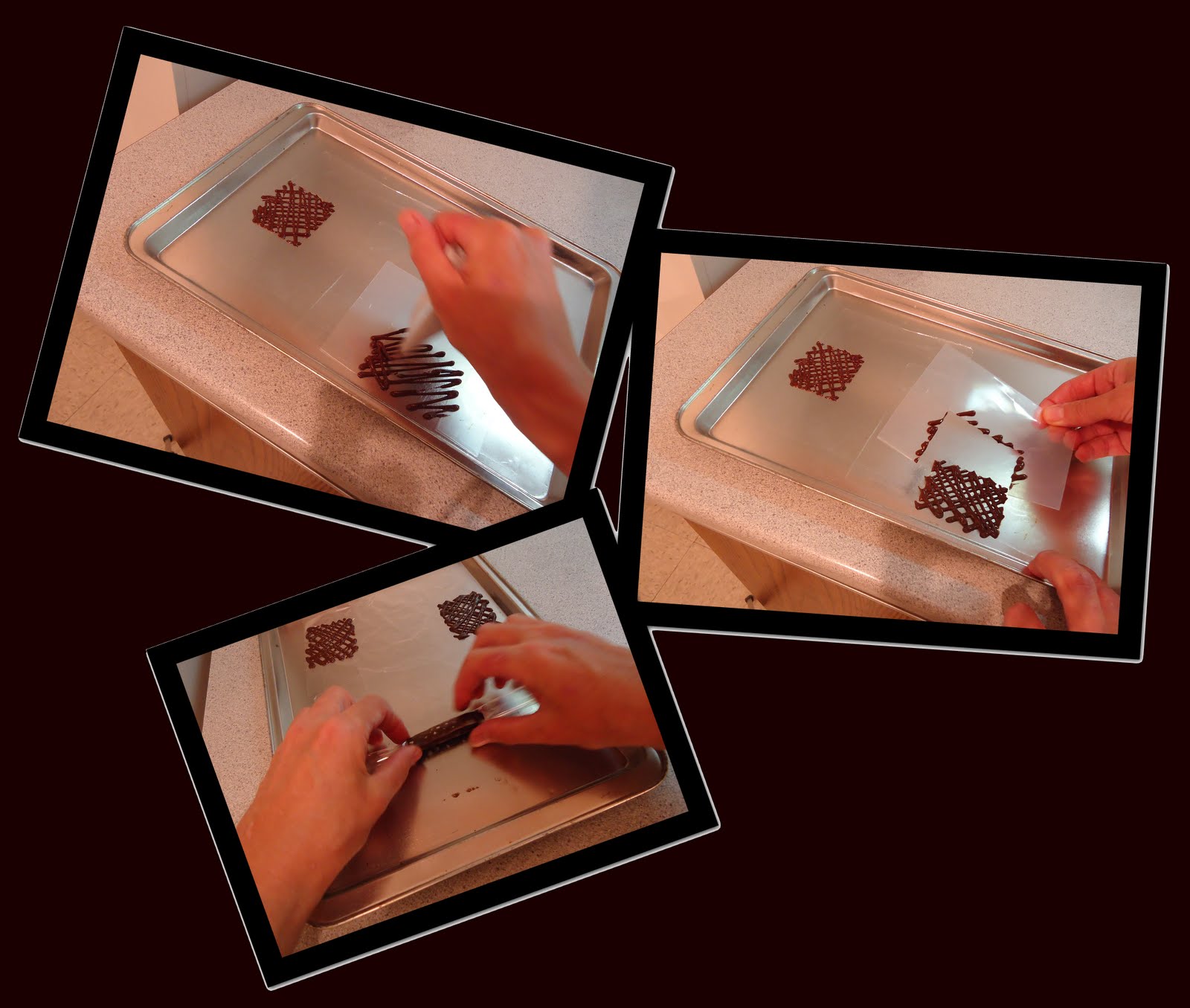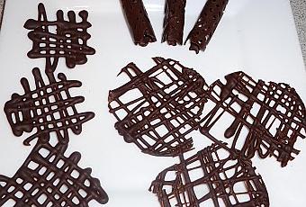 Voici la quatrième partie de la série des petits décors en chocolat.Cette fois j'utilise un cornet rempli de chocolat noir tempéré pour dessiner des grilles qui peuvent être utilisées telles quelles, découpées à l'emporte-pièce ou encore, roulées sur elles-même.
