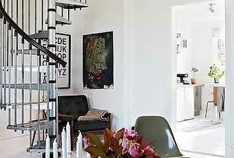 Another one of those lovely flats for sale in Sweden... What I like the most about this duplex is the bare concrete wall in the bedroom and in the kitchen, and the cool painting (wallpaper?) above the couch.