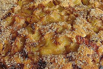 75 g de beurre - 2 cs d'huile d'olive - 1 oeuf - 160 g de cassonade - 1 cc de vanille liquide - 2 cs de cannelle - 1 pincée de sel - 200 ml de lait - 1 sachet de levure - 320 g de farine - 500 g de rhubarbe épluchée et coupée en tronçons.