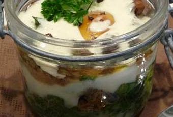 Tous les ingrédients de base sont prêts. Il ne vous reste plus maintenant, qu’à déposer au fond de chaque ramequin : une bonne cuillère à soupe d’épinards, puis des copeaux de tomates confites pour la couleur avant de les recouvrir d’une partie de la poêlée de champignons.