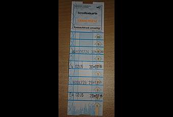 - Si l'on est seul: acheter une 'Streifenkarte' (carte à bandes), composter deux bandes de la carte pour les zones intérieures, et acheter en plus une Tageskarte Aussenraum, une carte journalière pour les zones extérieures à 5,40 euros, et la composter également. Coût total: 2,40 (deux bandes de la Streifenkarte qui coûte 12 euros pour 10 bandes) + 5,40 euros, soient 7,80 euros. Il faut évidemment pour cette construction avoir l'usage des autres bandes de la Streifenkarte à une autre occasion.