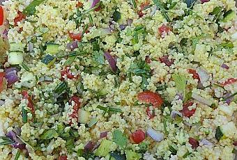 - 20 cl d'huile d'olive une cas de chaque herbe persil, ciboulette, estragon -coriandre- basilic-sel, poivre- 400 g de semoule couscous