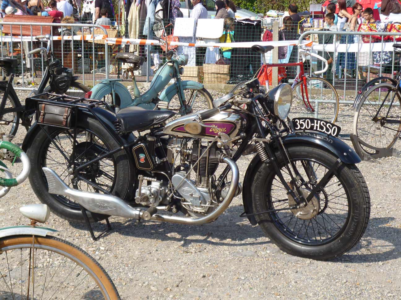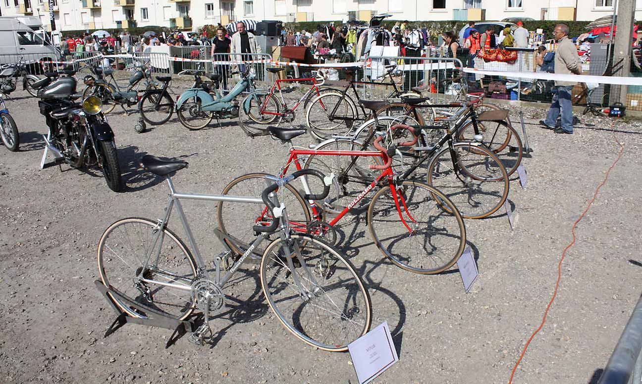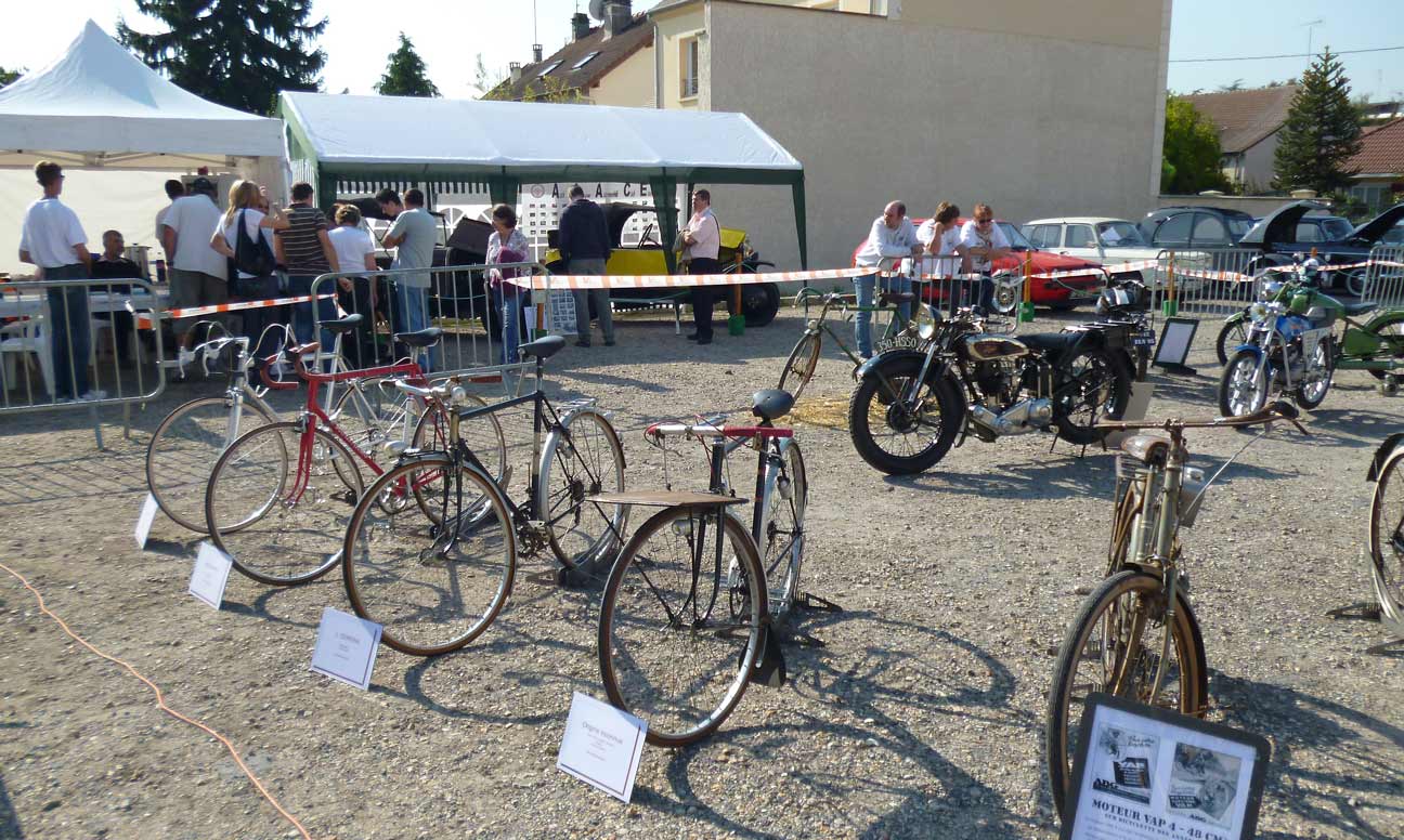 Sous le soleil exactement, s'est tenue l'édition 2011 de la Foire de Domont.Voici quelques photos de l'exposition de vélos, motos et autos anciennes, présentées au public le week-end dernier. Bicyclette Terrot dans sa paille... Une belle moto de la même marque Une magnifique Zenith de 1918 avec des freins à patins, comme les vélos! Et un cadre Caminargent