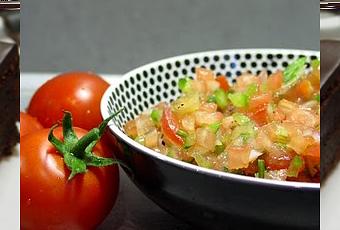 Rincer, peler et épépiner les tomates. Les concasser très finement, et les placer dans un petit saladier. Rincer le poivron et le piment. Retirer les graines, et les tailler également en tout petits dés. De même avec l'échalote.