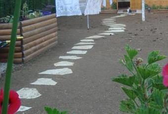 02/10/2011 Suivez-moi, je vous emmène faire un petit tour dans le chalet!Vous devez remarquer qu'à présent, nous avons des pas japonais pour accéder facilement au chalet. Nous avons fait faire des travaux dans notre jardin. Je vous en parlerai plus longuement une autre fois.