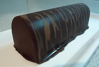 Voici une mini bûche à la crème glacée recouverte d'une mince couche de chocolat noir à 65%, décorée de zébrures en chocolat au lait.On commence par mouler la bûchette avec un bon chocolat de couverture tempéré puis on rempli avec la préparation de crème glacée (ici à la vanille et au chocolat). On laisse prendre au congélateur avant de fermer la base de la bûche avec du chocolat.