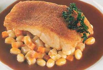 Bar en croute de bacon, jus aux cocos de Paimpol et pied de veau
