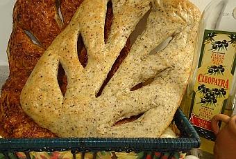 C'est après la première levée que j'ajoute les ingrédients particuliers à chaque variété. Ici, la pâte pour les fougasses est aromatisée à l'ail et aux herbes. Pour varier, j'ai fait une fougasse nature et une autre garnie "genre pizza", soit badigeonnée avec de la sauce tomate, et saupoudrée de fromage mozzarella râpé.