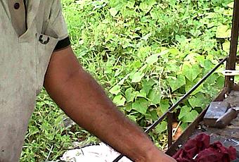 Sur son étale, Shabir découpe la noix verte de sa main experte.