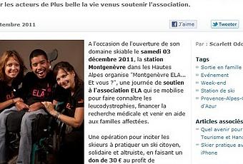 Le samedi 3 décembre 2011, à l'occasion de l'ouverture de son domaine skiable, la station Montgenèvre prépare une journée solidarité pour l'association ELA, pour faire connaître les leucodystrophies. Une opération mise en place pour inciter les skieurs citoyens à donner leur soutien, en faisant un don de 30€ au profit de l'association. Anyresa Mag vous offre l'occasion de montrer votre solidarité et de profiter des pistes durant la journée en rencontrant les acteurs de Plus Belle la vie.