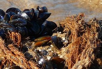 D’où viennent-elles ? elles viennent du printemps, et oui. Chaque année, fin mars début avril, des éleveurs de moule d’Ille-et-Vilaine viennent faire grandir leurs naissains dans des eaux moins fraiches que la Manche, en l’occurrence sur Oléron. Une fois la Manche tiédie et les moules grandies, tout le monde repart avec pieux, cordes et moules sous le bras, pour finir la croissance dans la Baie du Mont-St-Michel. J’avais raconté tout ça autrefois, dans le précédent blog (cliquez ici pour la piqûre de rappel). Mais forcément, depuis le printemps, le mouvement de l’océan est passé par là, arrachant quelques pieux, dénouant quelques cordes, avec des moules à bord. Les voici grandinettes, à la fin des marées d’équinoxe.