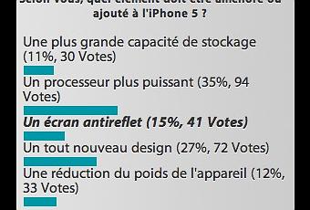Vous avez été 270 à participer au sondage qui vous demandait quel élément doit être amélioré ou ajouté à l’iPhone 5. Un gros merci.