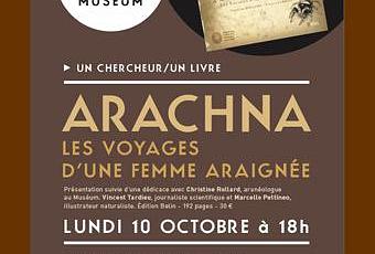 Présentation du livre « Arachna, Les voyages d’une femme araignée », par les auteurs : Christine Rollard (aranéologue et maître de conférences au Département de systématique et évolution du Muséum), Vincent Tardieu (journaliste scientifique spécialisé en écologie), Marcello Pettineo (illustrateur naturaliste).