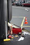 Paris / République - Les grands travaux Chaque jour davantage, depuis le début du projet UN JOUR, UNE PHOTO en janvier 2006, je suis heureux d'avoir toujours avec moi un appareil photo. Belle surprise ce matin que ce réparateur de Sanisette et son tas d'outils. Lui, je ne l'avais pas vu, caché qu'il était dans cette chambre forte, mais à peine a t-il sorti la main que j'ai réagi, au quart de tour ... à peu près ausi vite que ce pigeon, à qui il avait fait peur ...